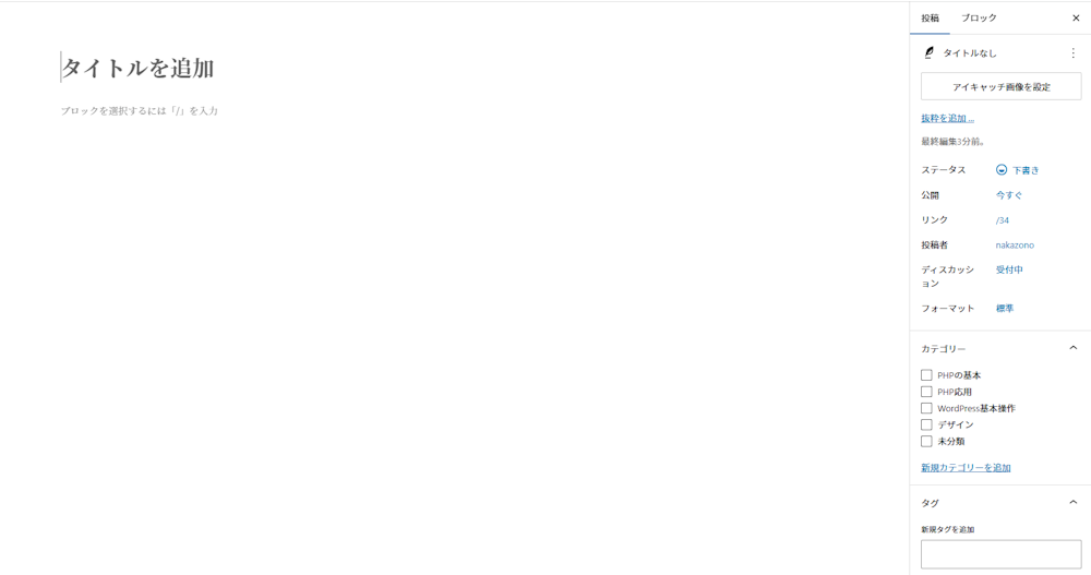 そこから「投稿」→「新規追加」と進むと、記事を書くためのエディター画面が表示されます。