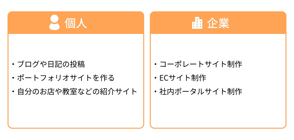 個人的な用途であれば、「ブログや日記を書く」「ポートフォリオサイトを作る」「自分のお店や教室などの紹介サイト」などで活用できます。